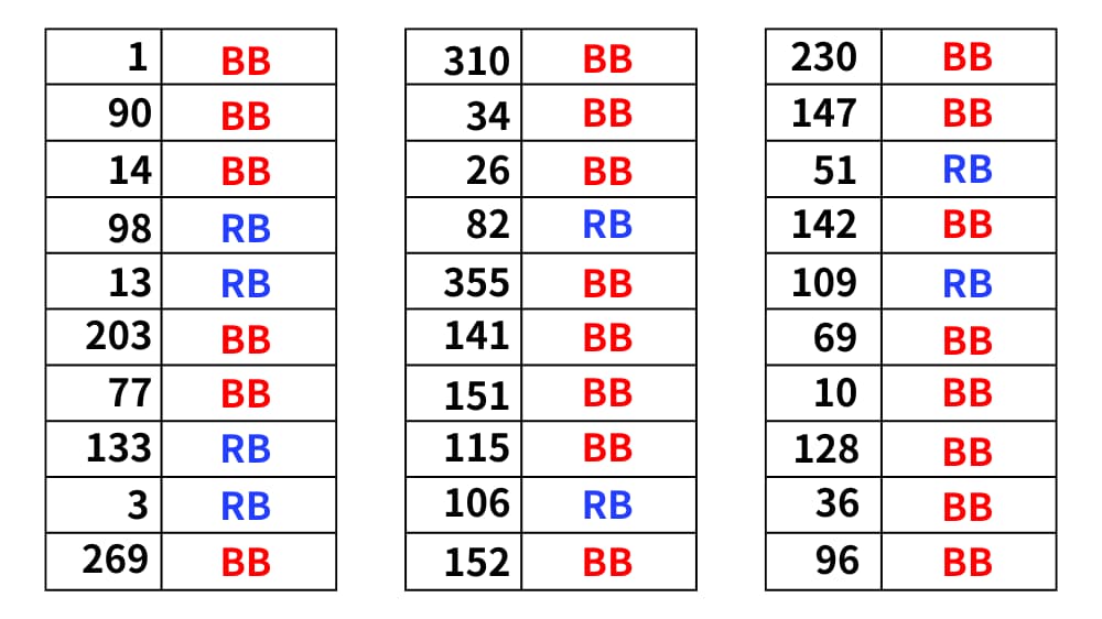 BB|RB共に、確率は現行機を下回るが、獲得出玉は6号機よりも多く、BIGは約312枚、REGは約104枚。